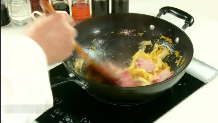 锅中倒入油,下入黄灯笼辣酱,翻炒数秒,下入酸菜和泡姜,煸炒出香味时,倒入部分鱼骨,翻炒片刻。