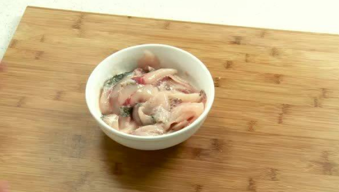 准备好鱼片,加入适量料酒、鸡蛋清、两勺生粉。