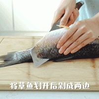买去鳞去内脏的草鱼,沿鱼尾处下刀贴着鱼骨将草鱼划开后剁成两边,用清水洗干净 *可以再刮干净剩下的鱼鳞和鱼肚子的黑膜