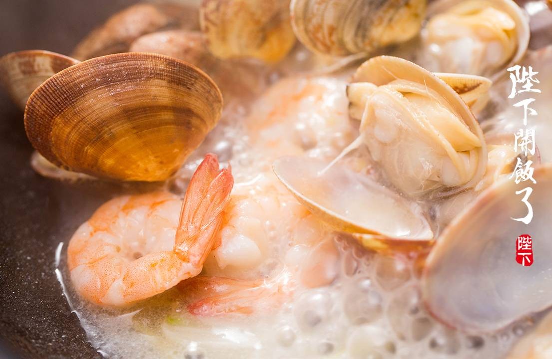 取锅,热油,加入姜蒜片爆香,加入虾,花蛤,爆炒后加入适量水,煮熟后盛起备用