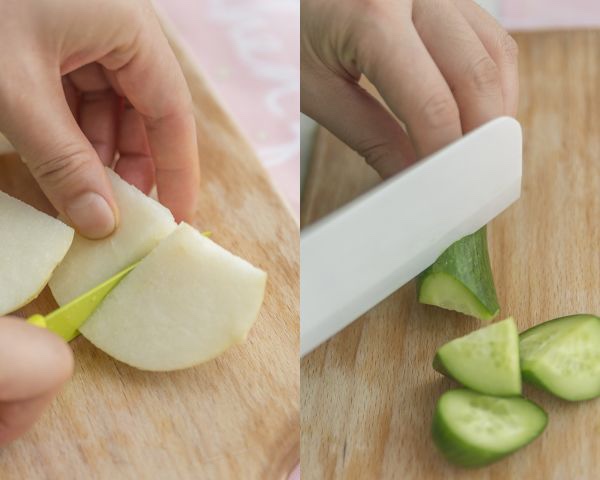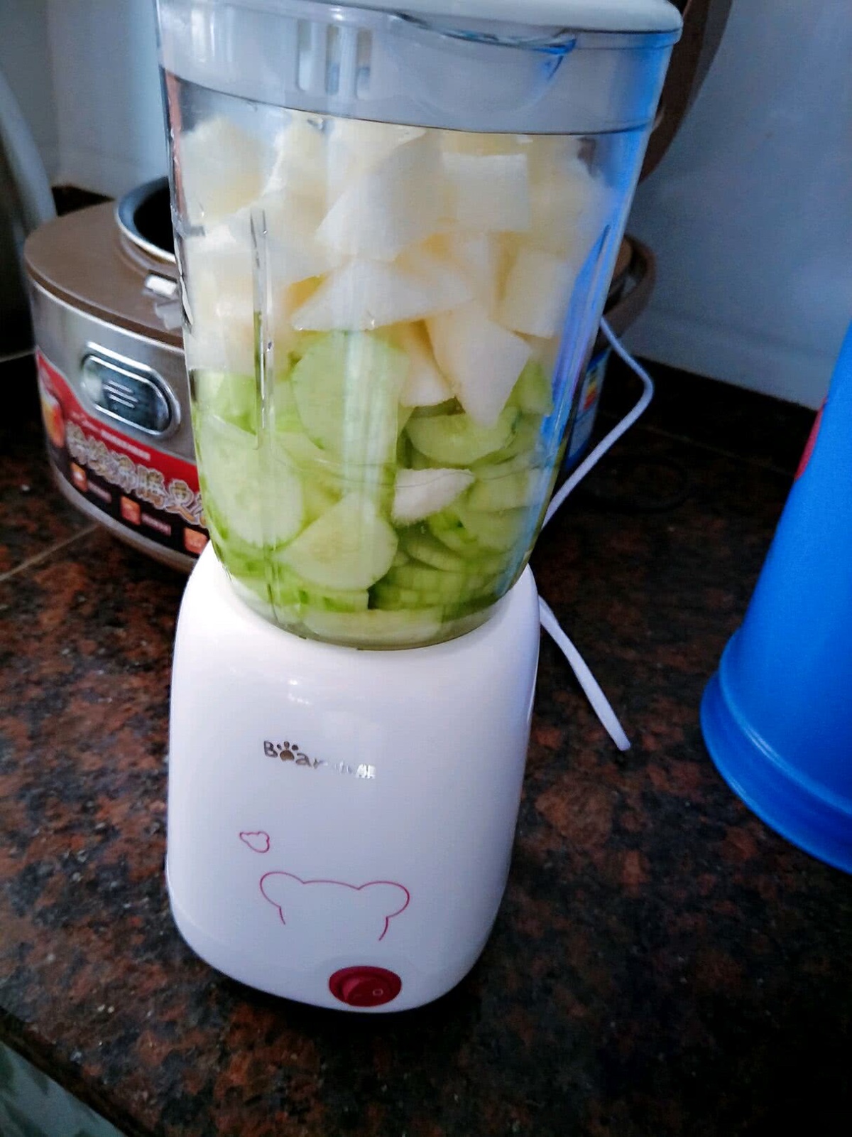 1.水果黄瓜洗干净后切块,雪梨洗干净后去皮切块去核