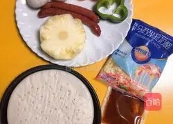 准备好披萨饼底、芝士碎、披萨酱、凤梨、香肠、彩椒、口蘑。