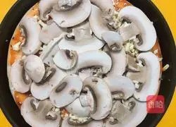 在披萨饼底上放上一层口蘑片。