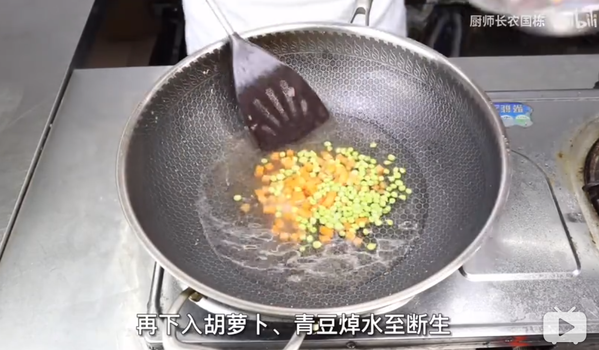 锅中加水,将胡萝卜/青豆焯水至断生