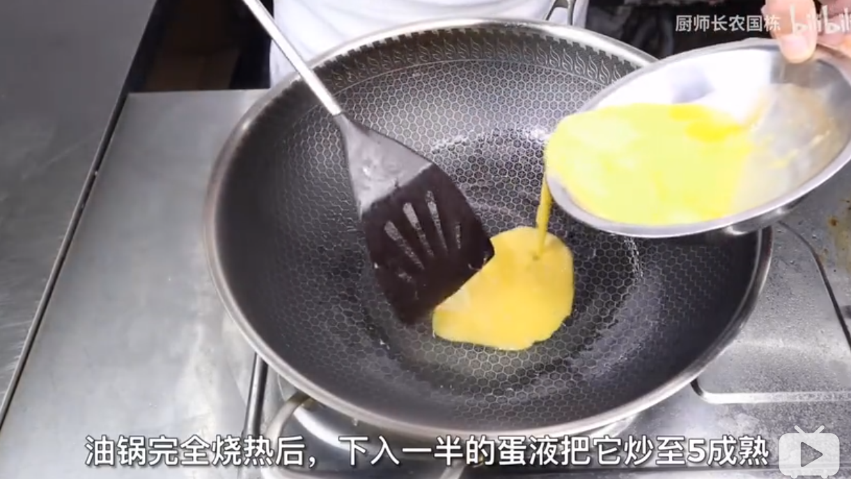 下入一半鸡蛋液炒至5分熟