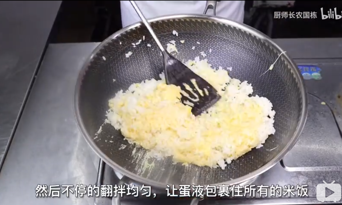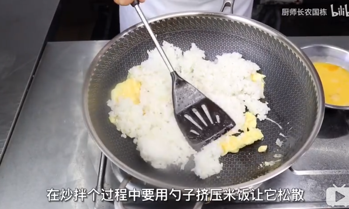 然后加入饭,用勺子压饭使米饭松散