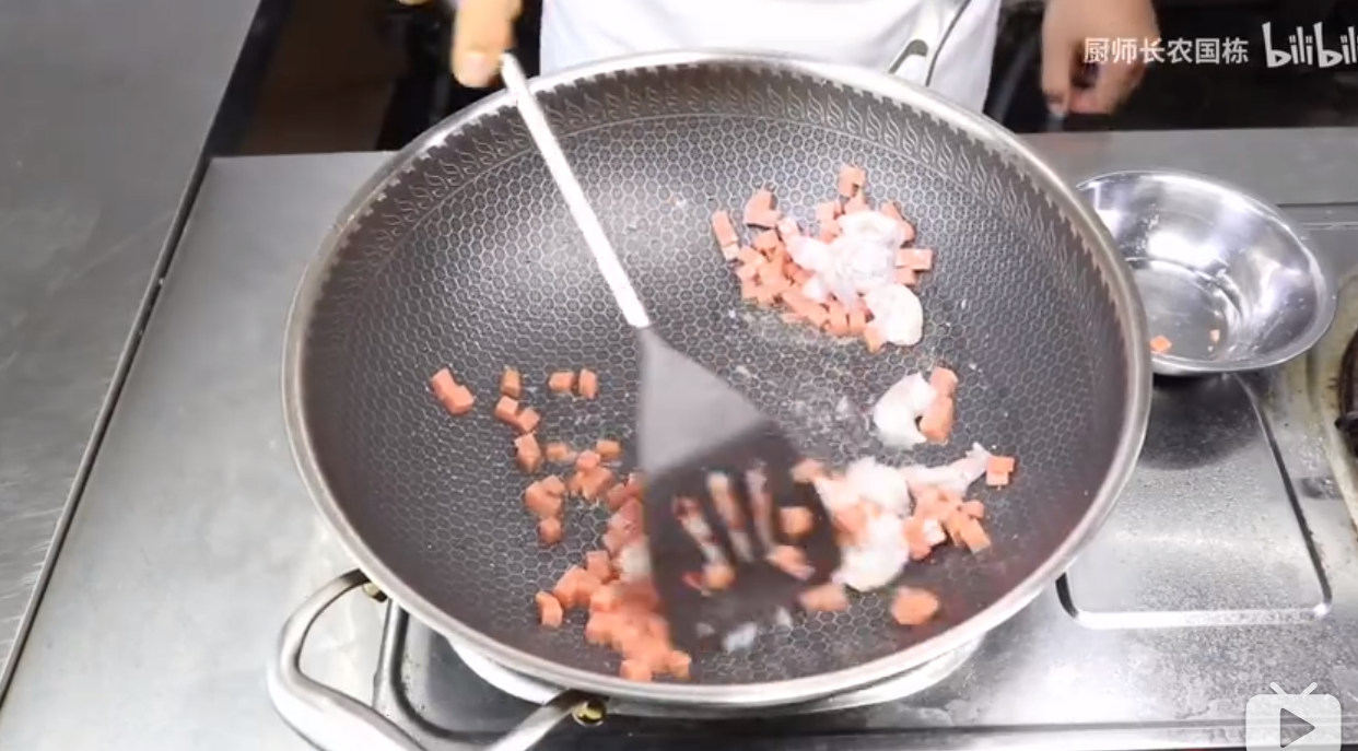 下入虾仁火腿丁炒熟