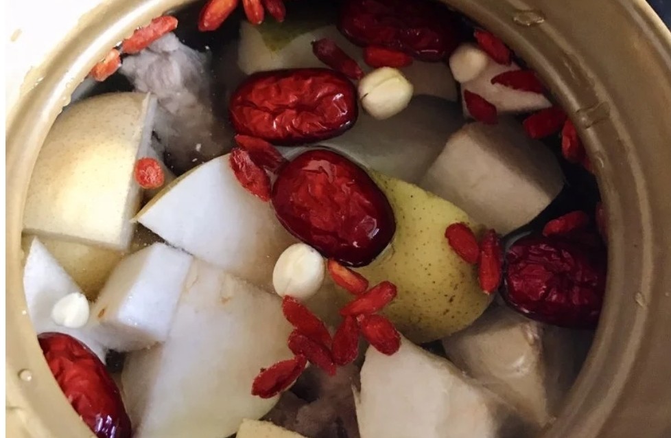 排骨洗干净焯水,雪梨两个,红枣枸杞南北杏适量