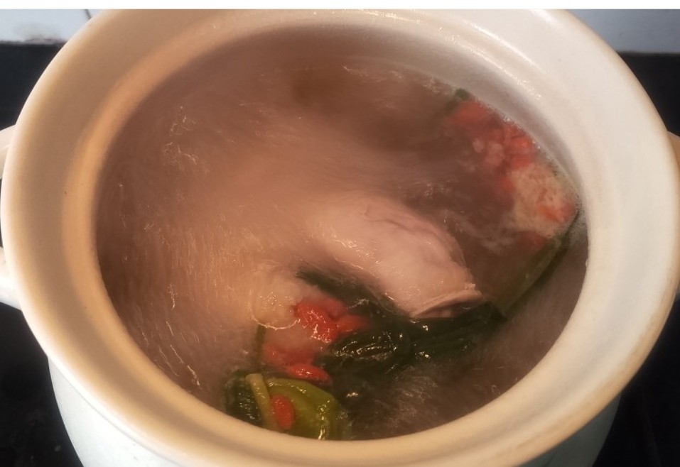 将包好的猪肚鸡放入砂锅中,放入剩余的姜,葱,枸杞,白胡椒