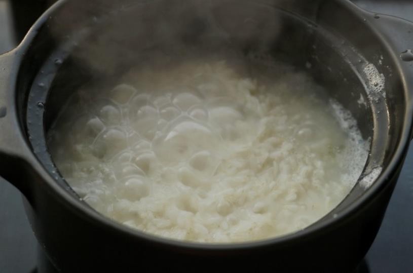 米洗净后放入砂锅,加入210克水。将砂锅放在电陶炉上煮,水开后转小火煮。
