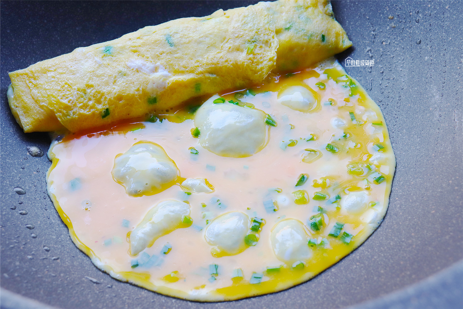 从右往左卷起,然后推至右边,往左边继续倒入1/5蛋液,转动锅子至均匀半凝固状态,从右往左卷起。