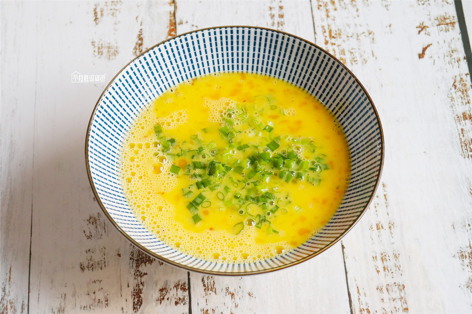 将香葱碎和盐放入蛋液,搅打均匀