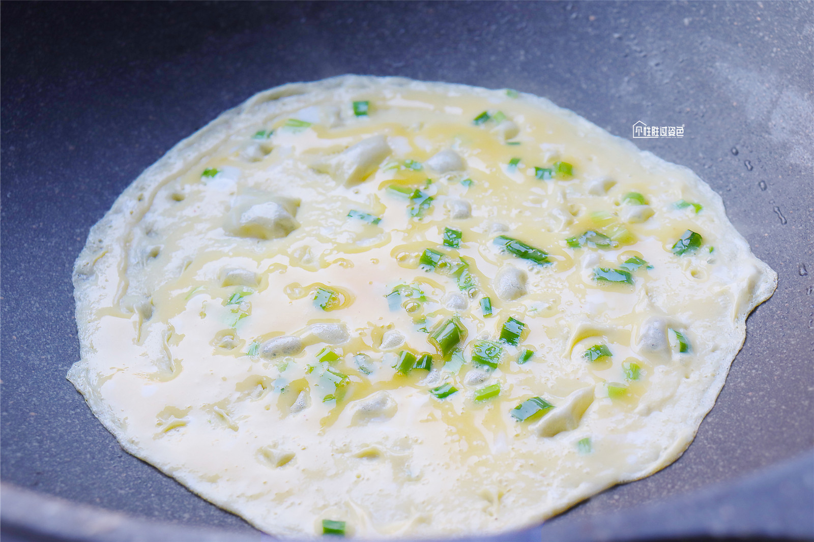 起锅热油转小火,倒入蛋液。锅里用刷子刷一层油,中小火,温热时,倒入约1/5蛋液,不停转动锅子,蛋液均匀铺满锅底至半凝固状态?(倒蛋液有个小技巧:最好从锅中心位置倒入,这样蛋液会往四周走,再提起过稍微晃一下,蛋液就会很平整了)