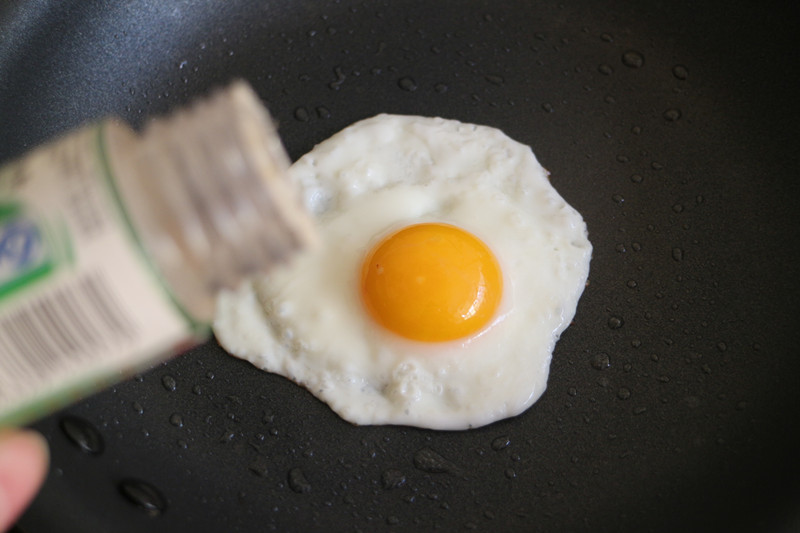 打开盖子,蛋黄基本凝固了,这时,撒些黑胡椒和盐调味。