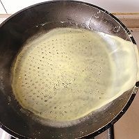 不沾锅内擦少许油,再用厨房纸擦掉,中高火热锅。拿起锅倒入面糊一勺,摇晃成圆铺满锅底后倒掉多余的面糊,放回灶台小火,加热到饼皮中间出现微微气泡。用小刀把边缘掀开一点点,拿起锅往下甩饼皮就会掉下来。全部做好可以用一个圆形盘子压在饼皮上,用小刀沿着边缘划开多余部分 一般一个蛋糕需要10-15张。