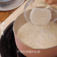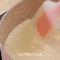 开小火,打蛋器缓慢搅拌牛奶至粘稠,牛奶已经变浓稠后用刮刀翻拌。