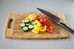 黄瓜切厚片,红椒黄椒切和牛肉差不多见方的大块。
