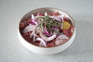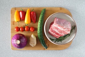 牛肋条肉切大块,2.5厘米见方合适。洋葱切丝,迷迭香两条揪碎,姜片,盐,多一些些的黑胡椒,适量植物油一起拌匀腌制2小时以上,过夜更好,也可以放一些蒜末增香。