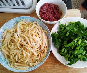粿条加适量酱油拌匀,牛肉加适量玉米油,沙茶酱,淀粉拌匀,芥兰洗净切小段。