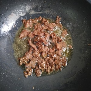 炒锅加适量猪油,倒入牛肉滑炒至变色,沥干油盛出。