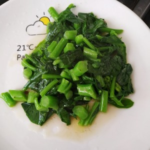 炒锅留底油炒芥兰至半熟,加少许盐,鸡精翻炒均匀盛出。