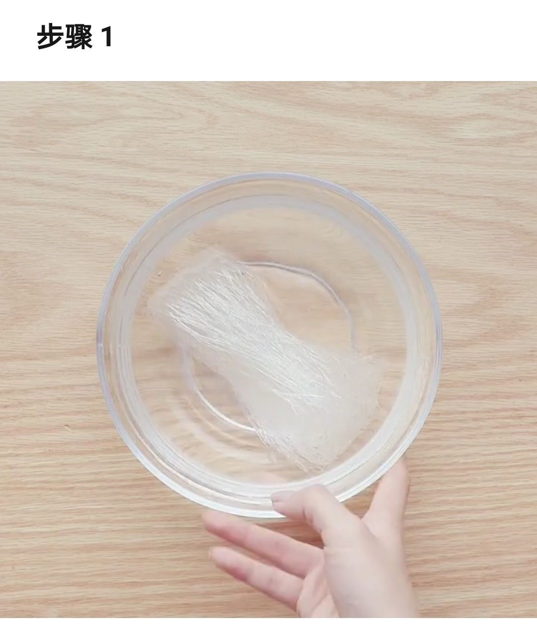 将粉丝提前用温水泡软 (如果赶时间,可以将粉丝放入水中,然后低火加热3分钟左右)