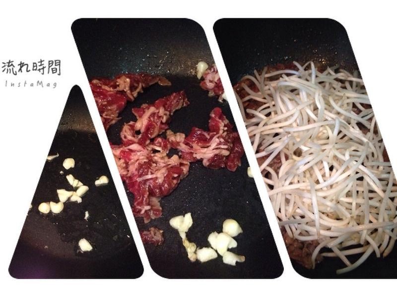 .放牛肉炒至7分熟,下豆芽快速拌,.起锅下少许酱油及葱段