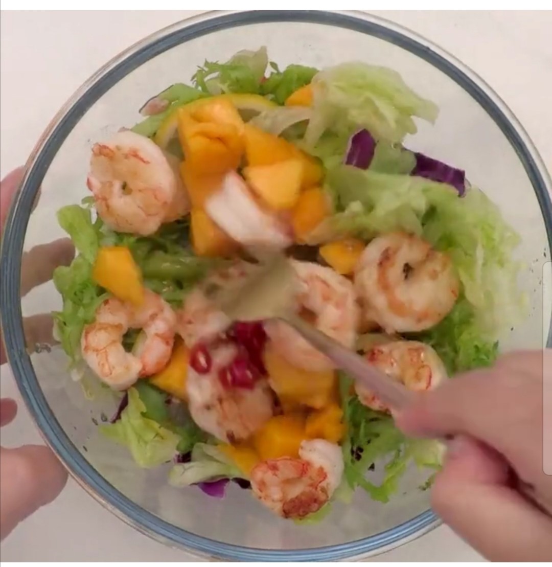 混合生菜加入芒果,虾,酱汁,挤柠檬汁,搅拌