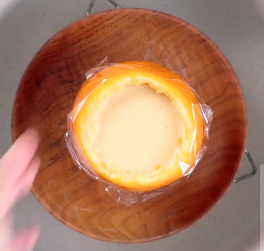 鸡蛋倒入橙子,盖上保鲜膜,牙签轧孔