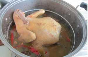 加土鸡,加盐,大火煮开后转小火煨煮到土鸡9成熟。捞起彻底凉透。