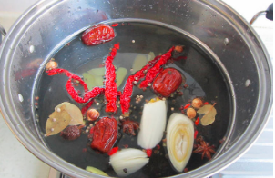 把姜切片、大葱切段。煮锅加水,加花椒粒、胡椒粒、八角、大葱等大火烧开,煮到香味出来。