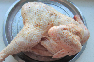 把土鸡收拾干净,洗净,用盐、花椒粉抹在土鸡全身,腌制20分钟。
