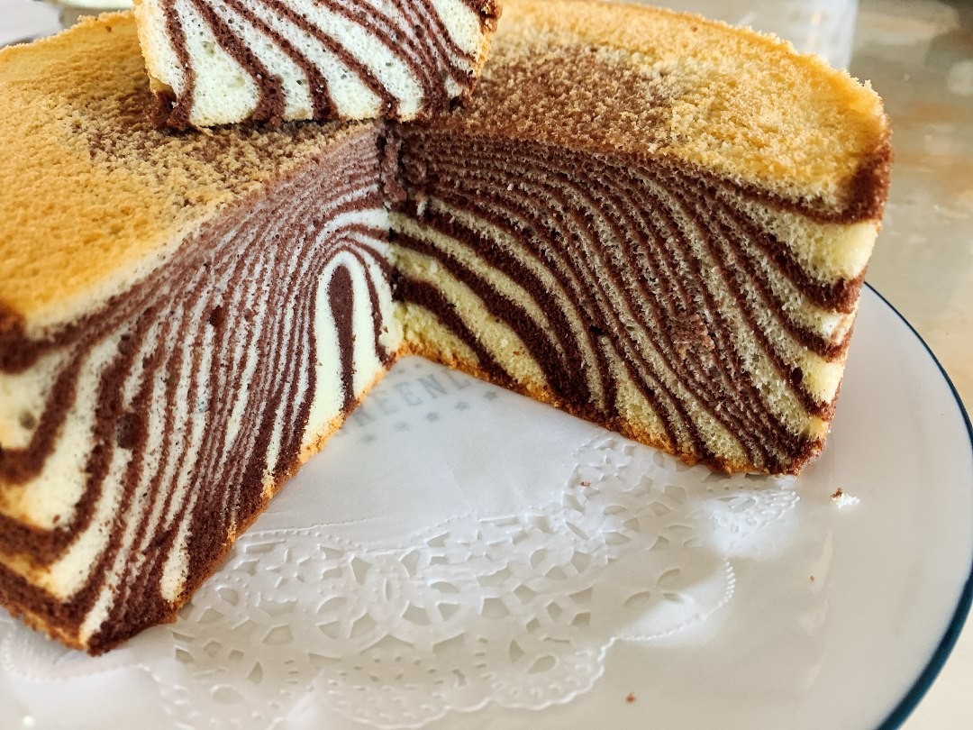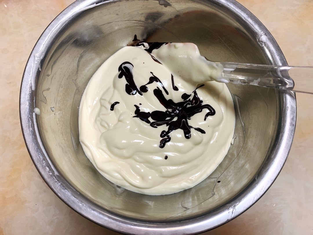 一勺原味蛋糕糊一勺可可味蛋糕糊,轮流加入,用牙签划出花纹。