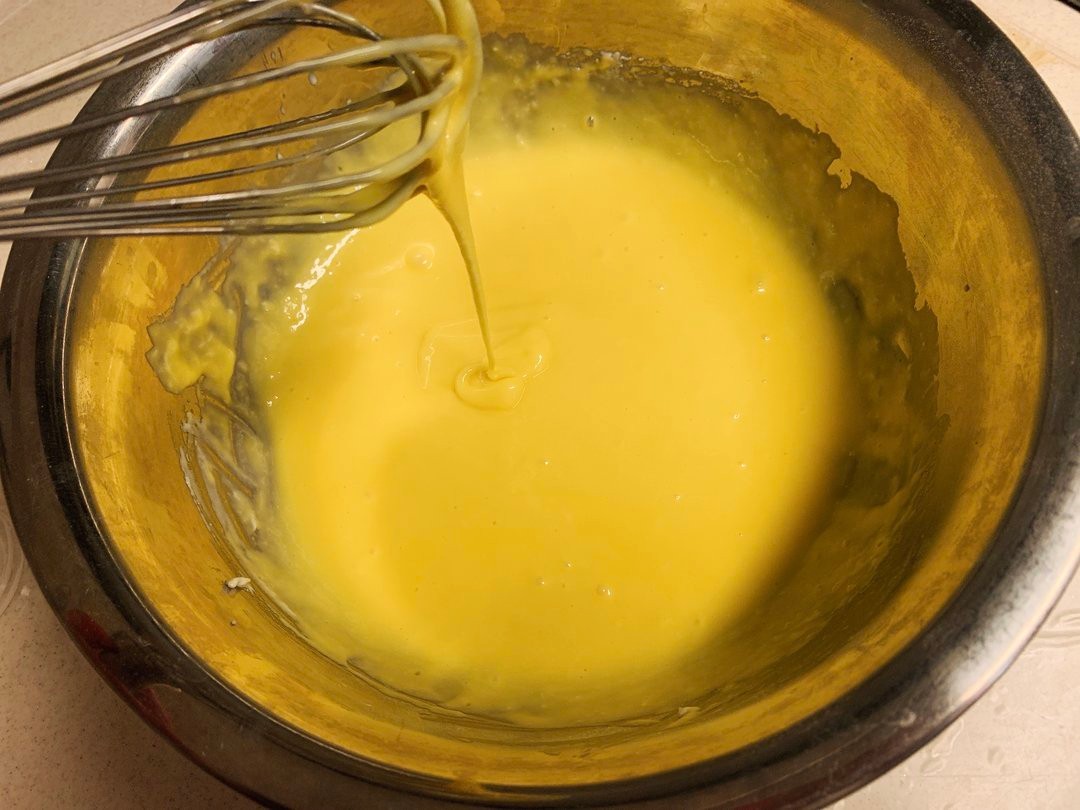 玉米油和牛奶倒入容器中搅拌均匀至完全乳化,加入低筋面粉搅拌至无干粉颗粒状,加入蛋黄搅拌均匀成顺滑状态备用。
