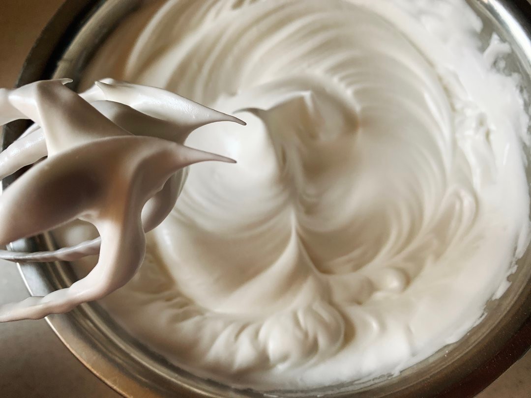 在蛋清中加入柠檬汁,细砂糖分三次加入,打发至干性发泡。