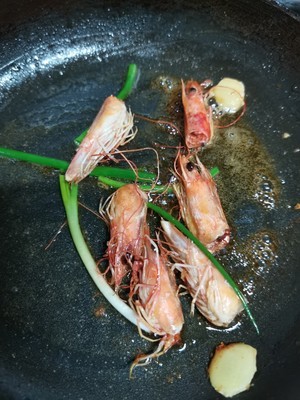 放点油把虾头和小葱姜片煸一会。这个过程的前提下是已经把米下到锅里煮了一会了!为了不浪费时间!