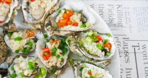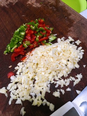3. 制作蒜蓉酱:蒜头、辣椒剁碎,用油小火煎一会,加盐、蚝油2勺、酱油1勺。调好后淋在生蚝上面