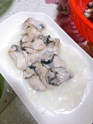 2. 龙口粉丝用温水泡软,剪短。铺在盘底,然后把生蚝铺在粉丝上