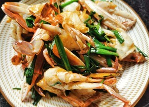 热锅下油,下姜片和葱白煸香,然后倒入螃蟹。尽量不要用锅铲动太频繁,容易把螃蟹的肉弄出来。可以颠一下锅或者稍微晃一下锅。