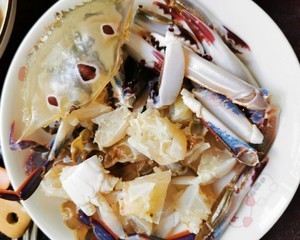 先把大钳先卸了,然后在嘴巴和眼睛那里把壳撬开,然后用干净的刷子把脏东西刷掉,然后把螃蟹连着脚,一开二,二开四,一个螃蟹剁四块就好了。钳那里的话稍微拍一下,切断。
