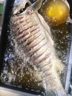 20分钟后 沥干水分 均匀的涂抹一层淀粉 起锅烧油70度油温 用勺子浇鱼的两面定型 然后放入油锅炸