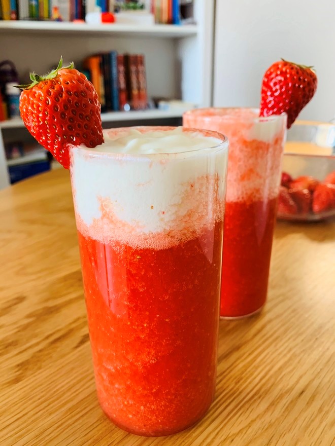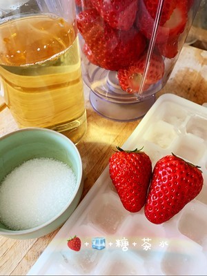 草莓洗净去蒂,和冰块、放凉的茶水、糖一起放入搅拌机打碎。