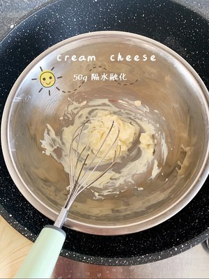 奶油奶酪隔水融化,稍放凉备用。
