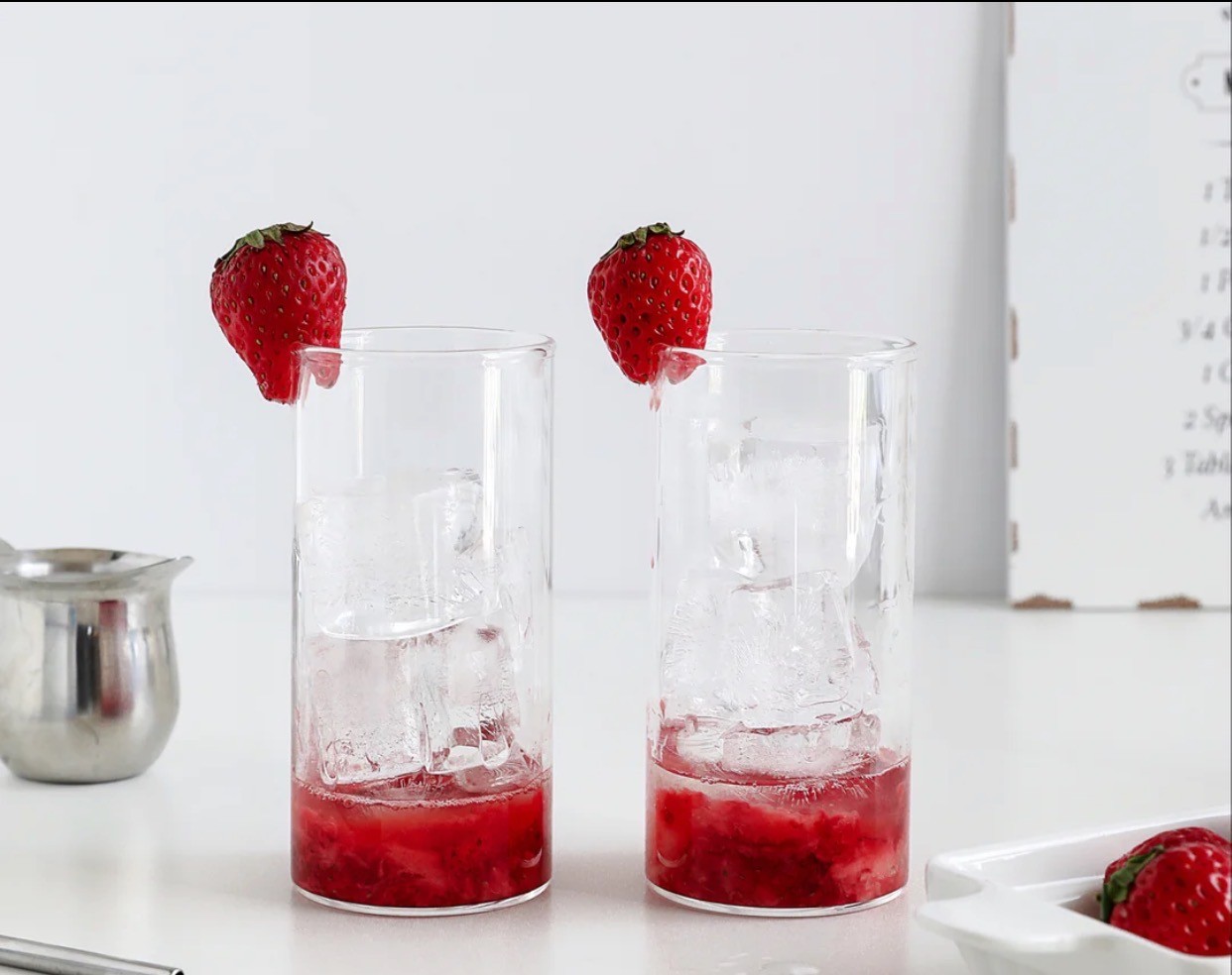 将草莓压碎,并加入冰块