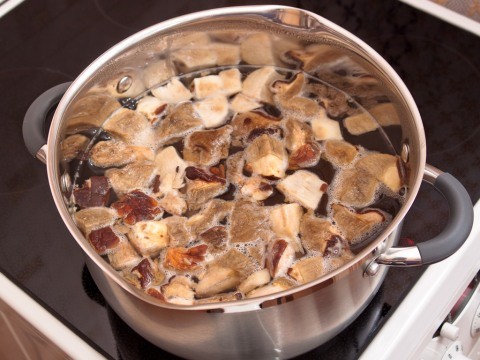 将蘑菇加入沸水(3-3.5升)中。 用盐和胡椒粉调味。 煮15–20分钟。 煮更长的蘑菇。