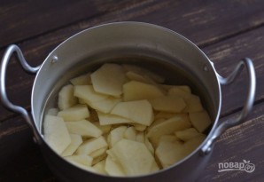 将土豆去皮洗净。 将其切成小块,放入锅中。 将土豆倒入清水,放在火炉上。 煮二十分钟直到嫩。