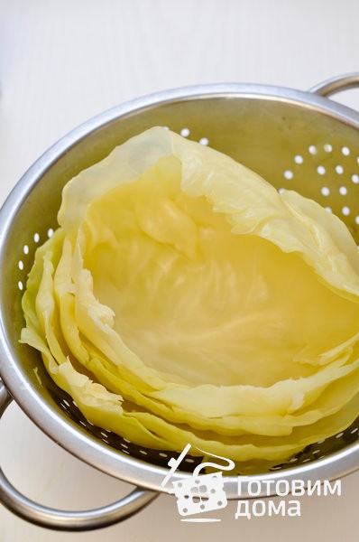 用水冲洗白菜头。 将卷心菜的头分解成单独的叶子(如果可能的话,不破坏叶子),并在沸腾的水中保持2-3分钟,直到叶子有弹性。 或用另一种方法准备白菜叶:从白菜头上切下一根茎,然后将白菜头整个浸入大锅中,用沸腾的盐水将其煮沸。 煮沸时,顶部的白菜叶会变得柔软而柔软。