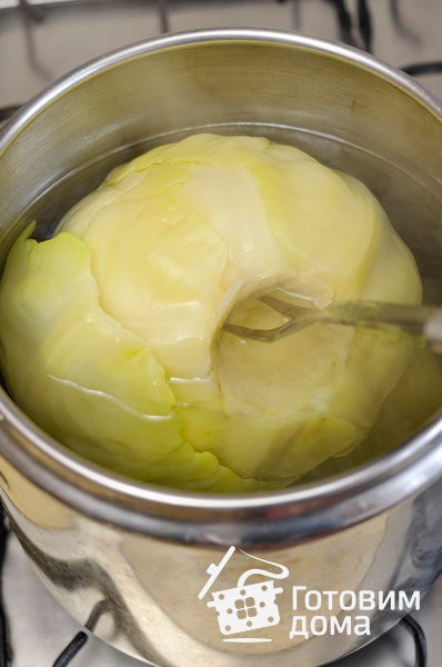 轻轻地(以免烧伤自己)将头从锅中取出,并分离上部的弹性叶子。 将白菜放回锅中,再次煮至变软。 建议不要长时间离开卷心菜的头部,以免叶子煮得太熟而变得太软。 因此,煮沸头直到可以从中分离出大片叶子。