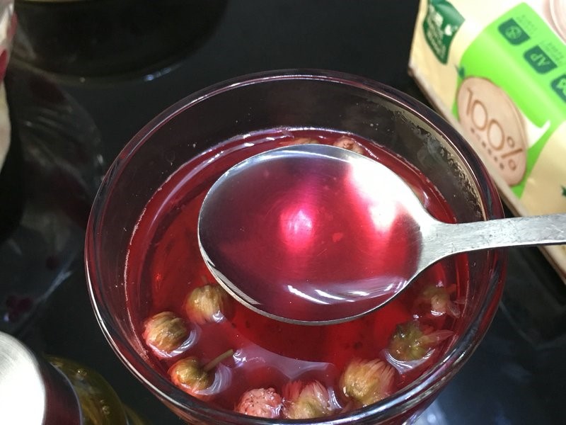 煮好,加几颗菊花放进杯子,然后把水果茶倒入被子里,就可以愉快的享用美食啦(觉得不够甜的,加点蜂蜜味道会更好哦)