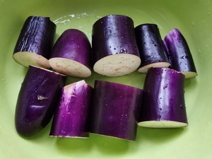 茄子洗净,先切成几段(三寸左右一段),将每段对半再对半竖切分成四瓣。